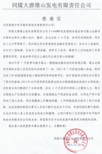 當前位置: 國能中電公司動態(tài)> 塔山項目感謝信