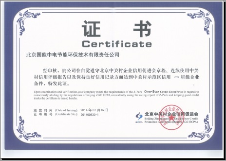 當(dāng)前位置: 國能中電公司動(dòng)態(tài)> 熱烈祝賀我公司榮獲“中關(guān)村示范區(qū)信用一星級(jí)企業(yè)證書”